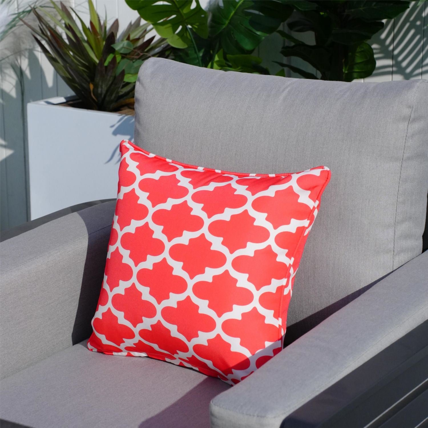 Infuse your home decor with a burst of color and style with this set of 2 throw pillows, each measuring 16.54" x 16.54". These pillows feature a striking red and white geometric pattern that adds a vibrant and contemporary touch to any space. Crafted from high-quality polyester fabric and designed with single-seam stitching, these pillows are durable and long-lasting. The pillows are filled with AA-grade doll cotton, providing a soft and comfortable feel. Perfect for both indoor and outdoor settings, these pillows will enhance the aesthetic appeal of your seating areas.